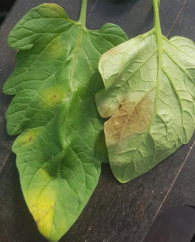 Det kan være svært at se forskel på tomatskimmel (Phytophthora infestans - samme art som kartoffelskimmel) og gråskimmel, men med en lup kan man ofte se, at sporerne af gråskimmel også ofte er at finde på oversiden af bladene, hvorimod sporer af tomatskimmel ses på undersiden af bladene.